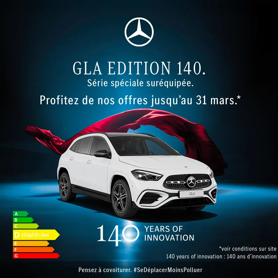 Consommations en cycle mixte WLTP : 6,5-7,2 l/100 km (GLA 180). Emissions de CO₂ en cycle mixte WLTP : 146-163 g/km (GLA 180). *Location Longue Durée : GLA 180 Edition 140, 45 000 km, sans apport, 37 loyers mensuels de 490 €. Modèle présenté : GLA 180 Edition 140, avec peinture Blanc Polaire et Pack Sport Black,