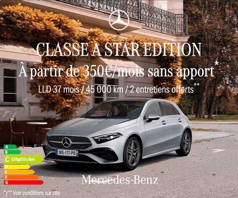Location Longue Durée : Classe A 180 Star Edition, 45 000 km, sans apport, 37 loyers mensuels de 350 €. Modèle présenté : Classe A 180 Star Edition, avec peinture Argent High-Tech, 45 000 km, 37 loyers mensuels de 359 €. Offre au prix tarif remisé du 01/01/26, valable dans la limite des stocks disponibles pour toute commande d’un véhicule neuf du 01/01/26 au 31/03/26 et livraison avant le 30/09/26 chez les distributeurs participants, sous réserve d’acceptation du dossier par Mercedes-Benz Financial Services SA, 7 av. Niepce, 78180 Montigny. RCS Versailles 304 974 249, N° ORIAS 07009177, N° ICS FR77ZZZ149071.