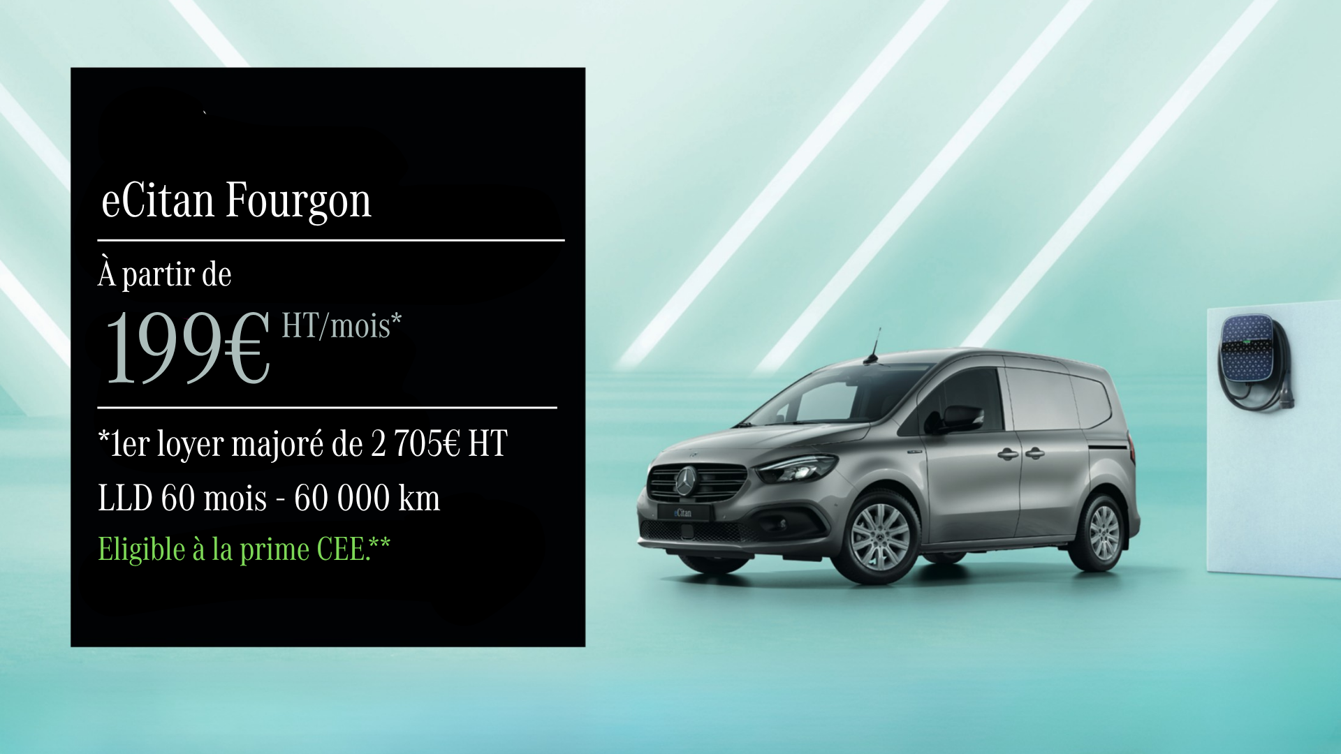 Location Longue Durée : eCitan Fourgon long BASE, 60 000 km, 1er loyer majoré de 2705 € HT suivi de 59 loyers de 199 € HT.